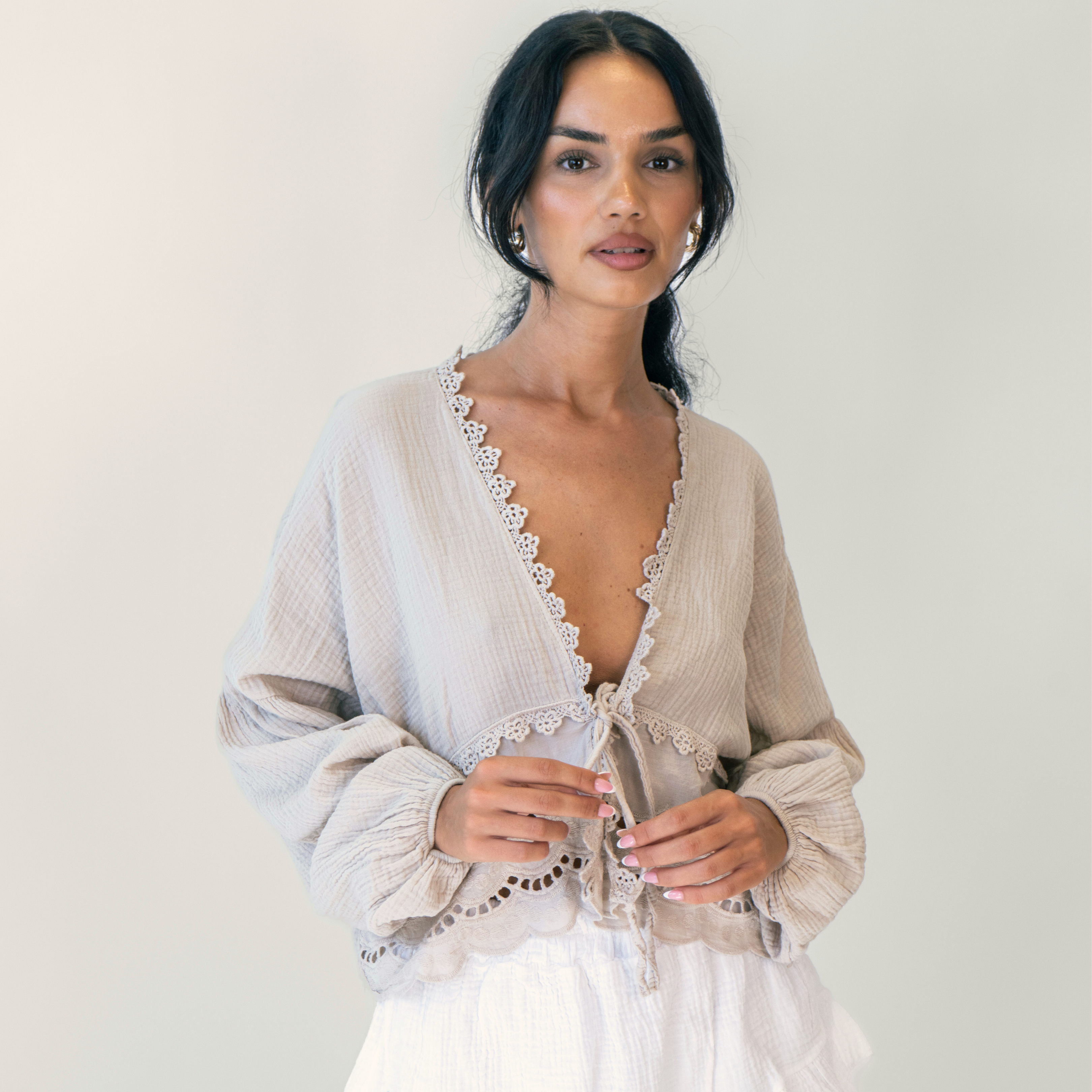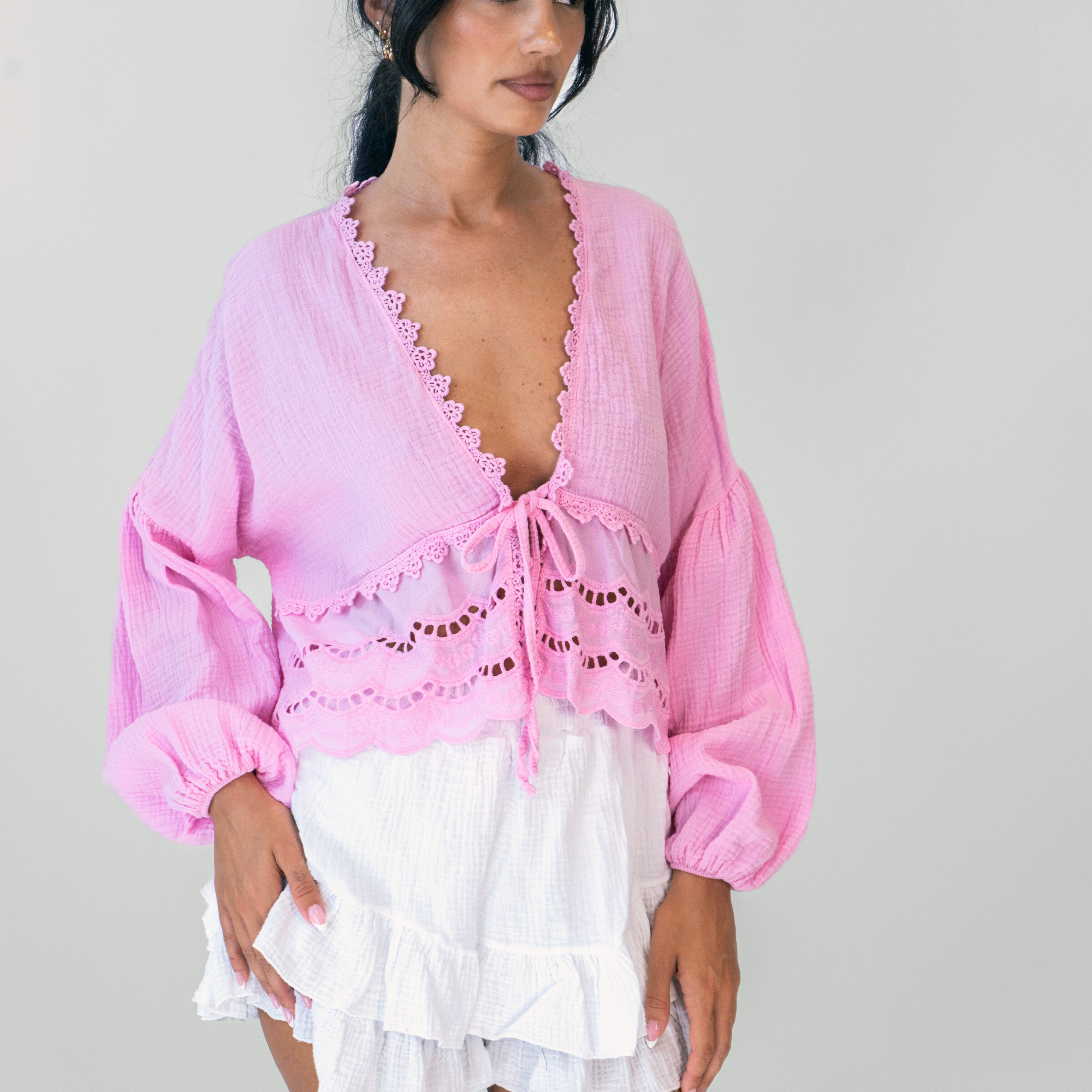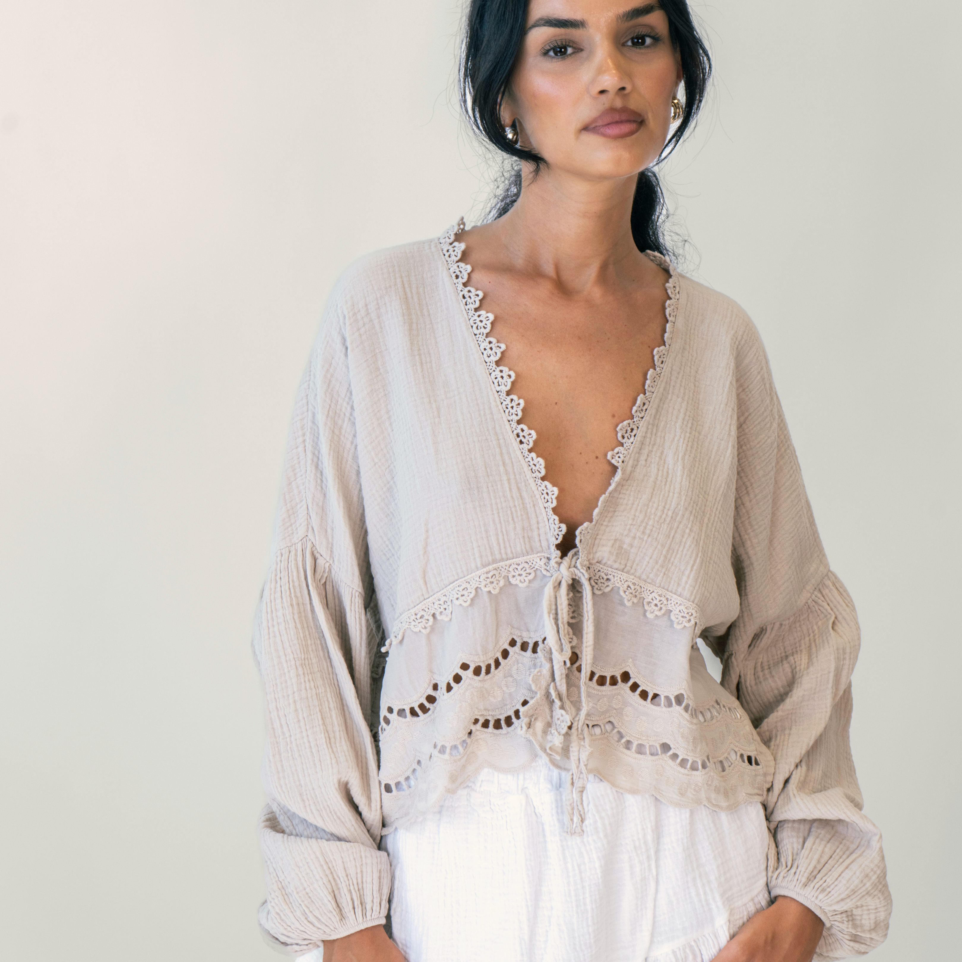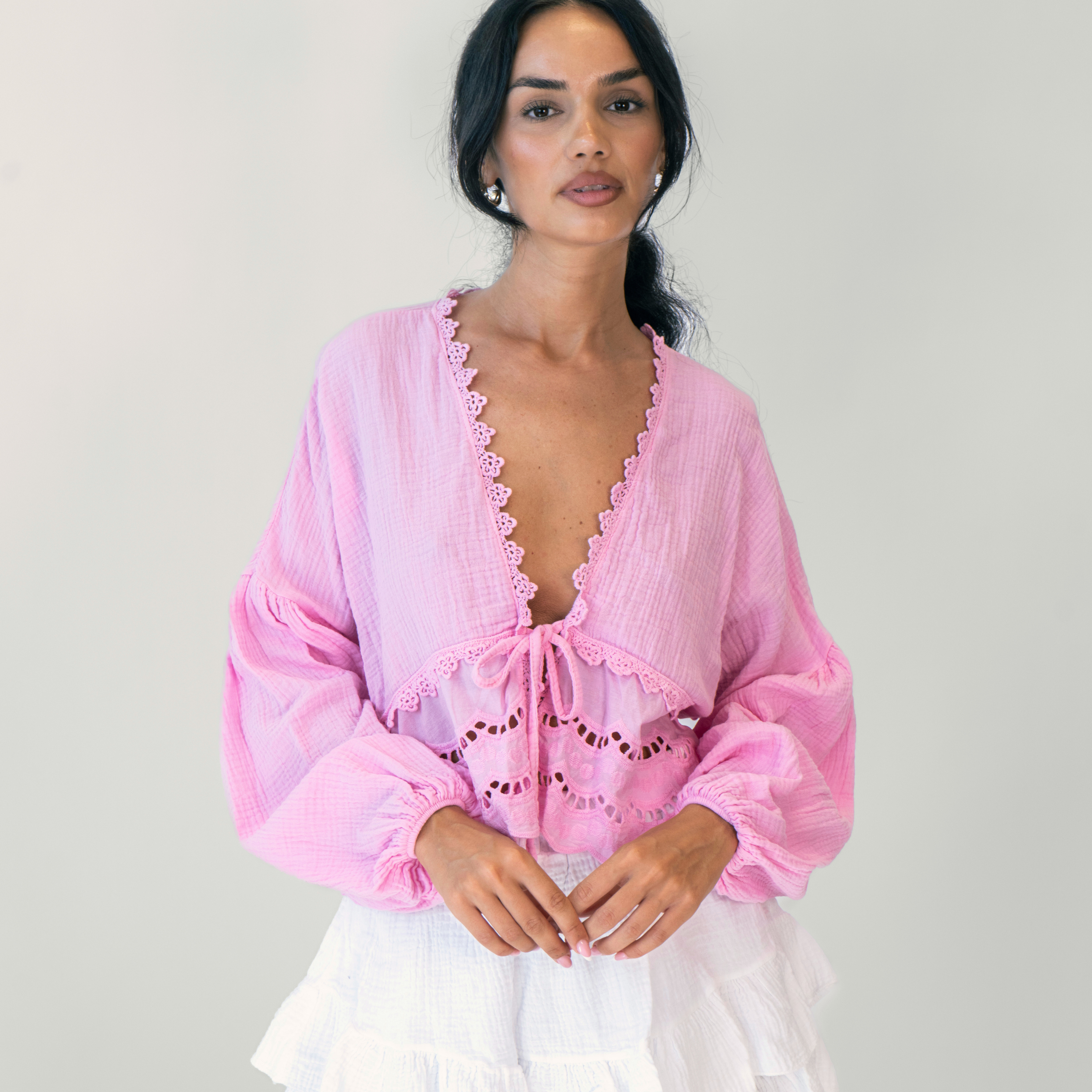 Leicht, luftig, liebevoll – die Boho Musselin Blush ist die perfekte Sommerbluse für romantische Boho-Momente. Aus weichem Musselin gefertigt, schmeichelt sie der Haut und sorgt für ein luftiges Tragegefühl. Verspielte Spitzendetails, zarte Stickereien und die feminine Bindung vorn machen diese Bluse zu einem echten Highlight für sonnige Tage.