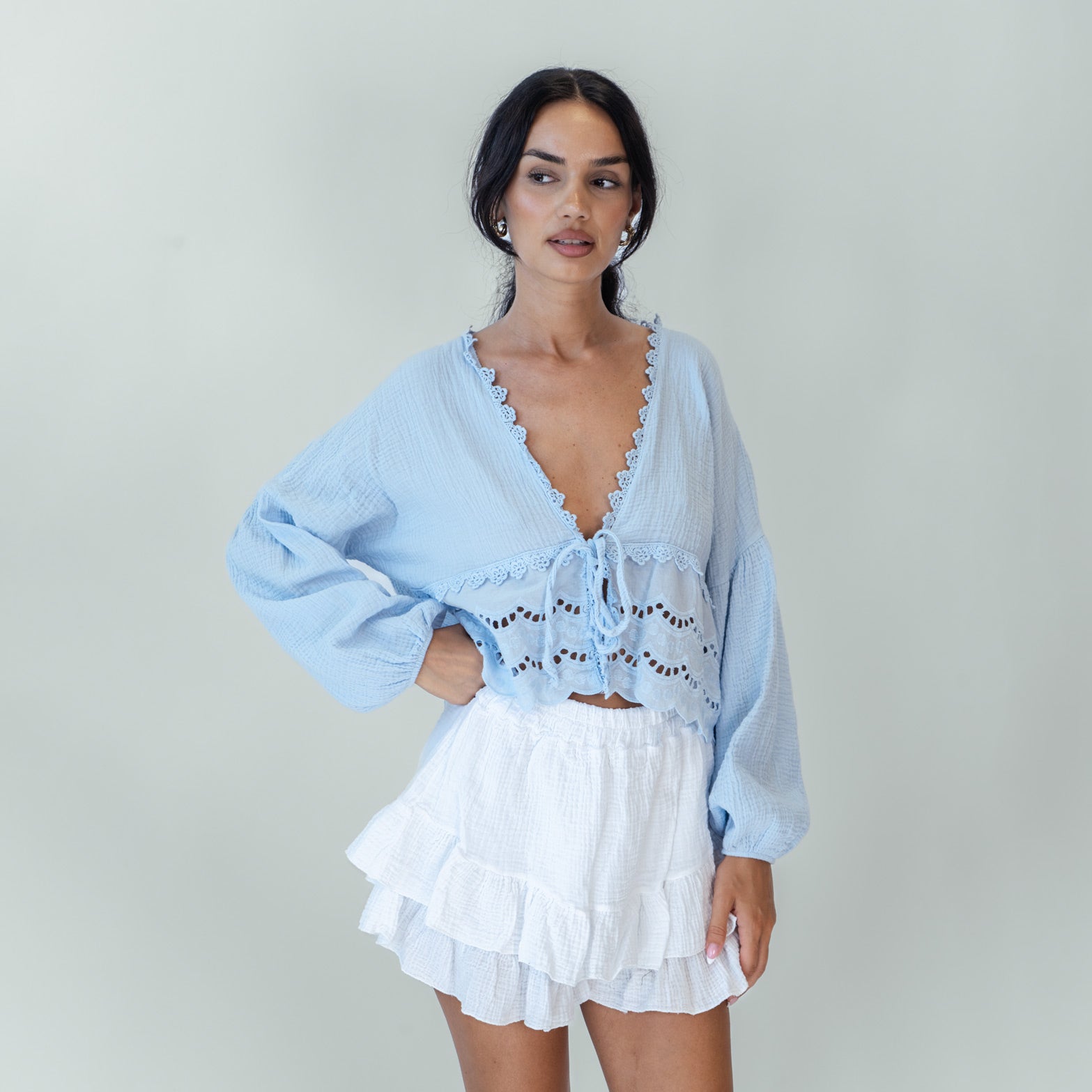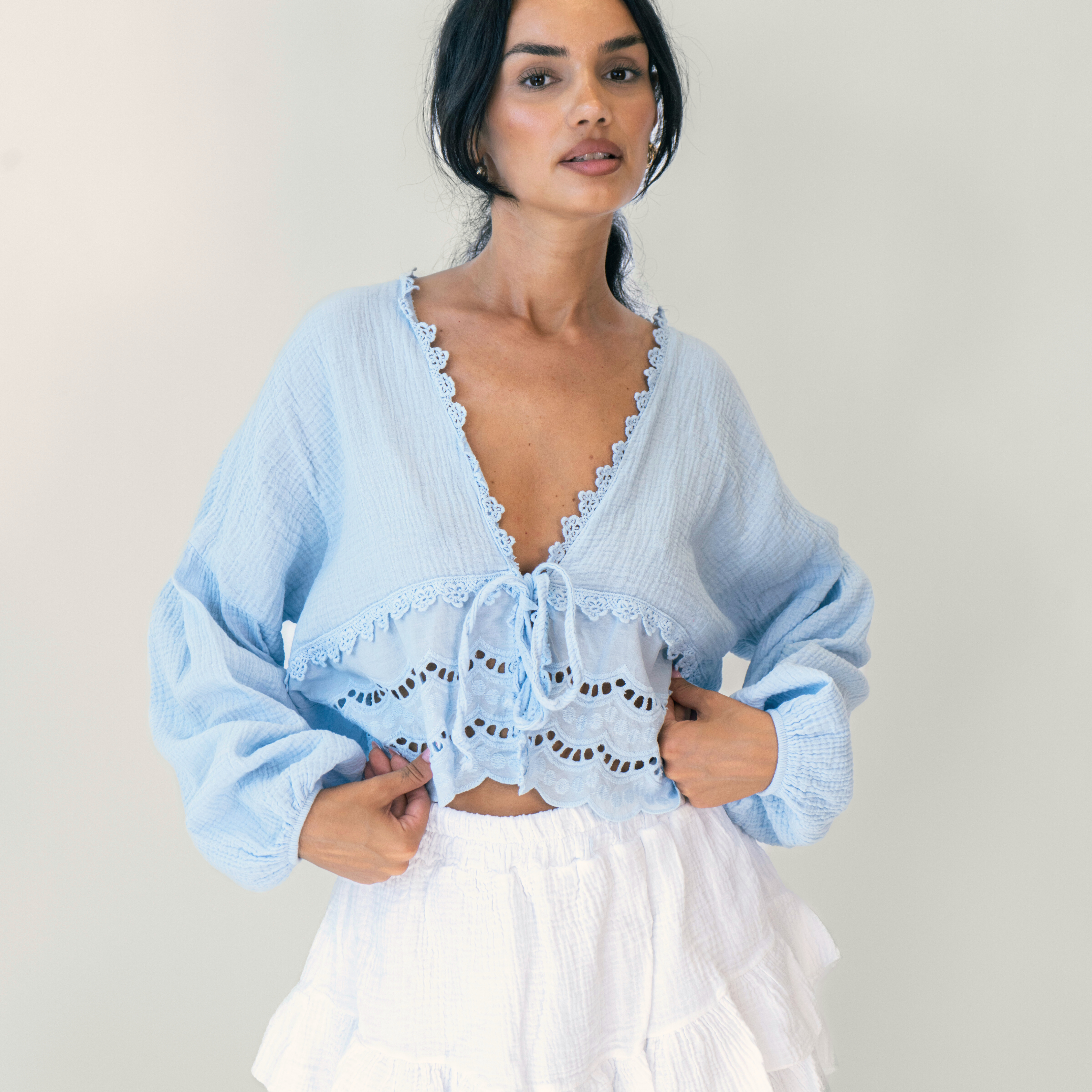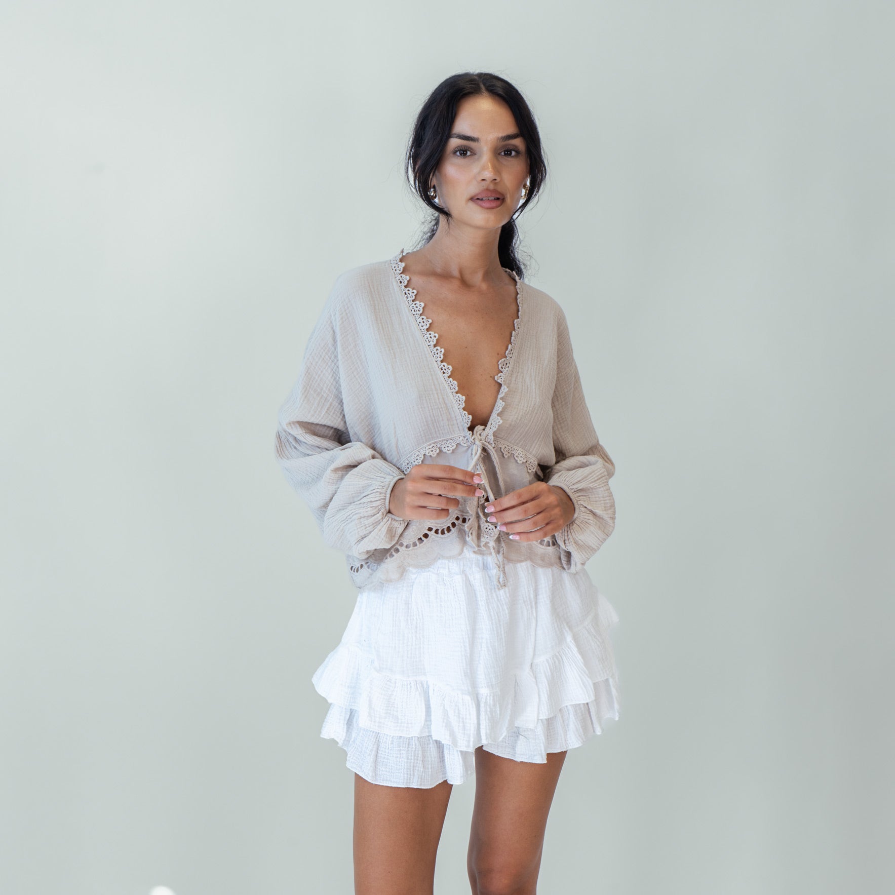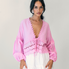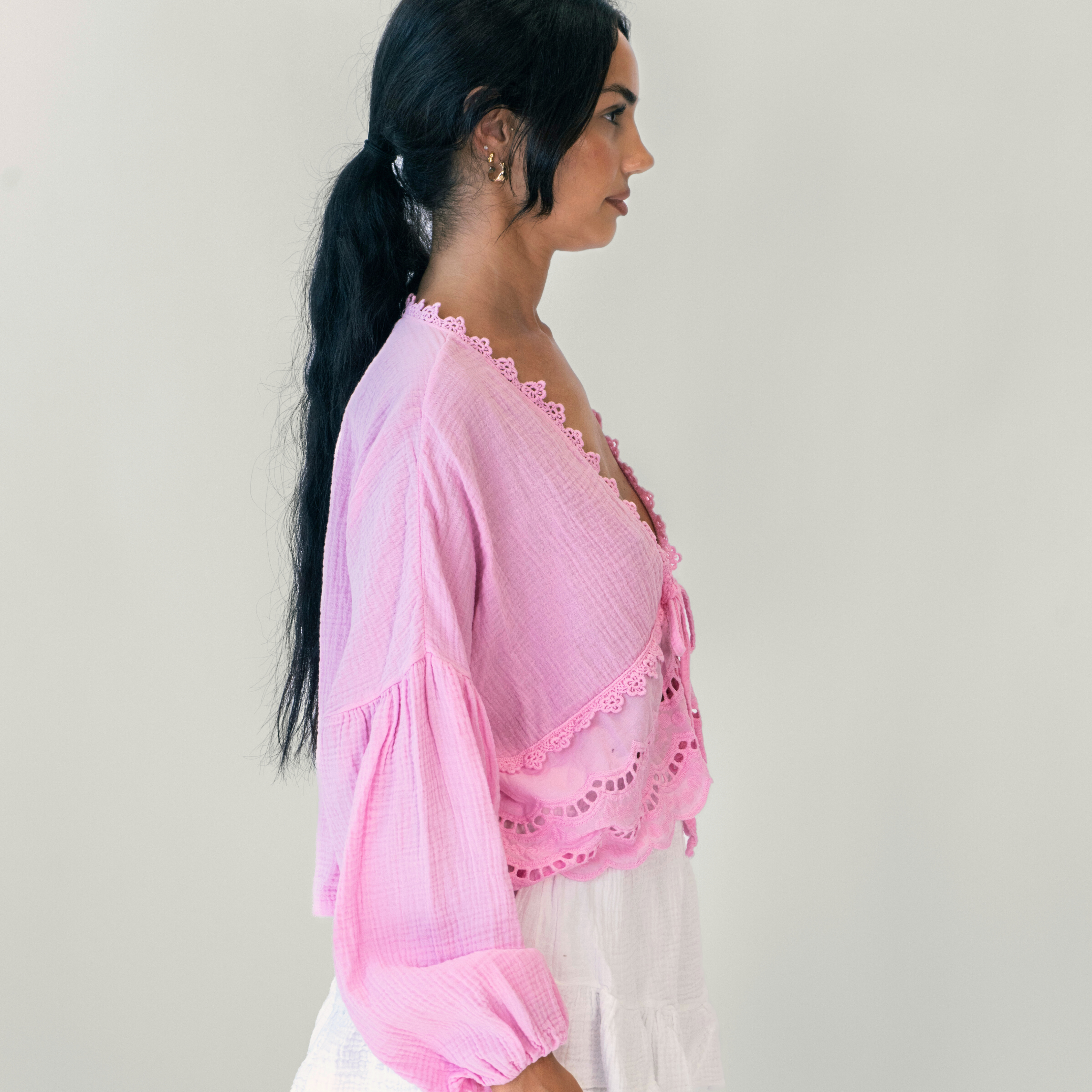 Leicht, luftig, liebevoll – die Boho Musselin Blush ist die perfekte Sommerbluse für romantische Boho-Momente. Aus weichem Musselin gefertigt, schmeichelt sie der Haut und sorgt für ein luftiges Tragegefühl. Verspielte Spitzendetails, zarte Stickereien und die feminine Bindung vorn machen diese Bluse zu einem echten Highlight für sonnige Tage.