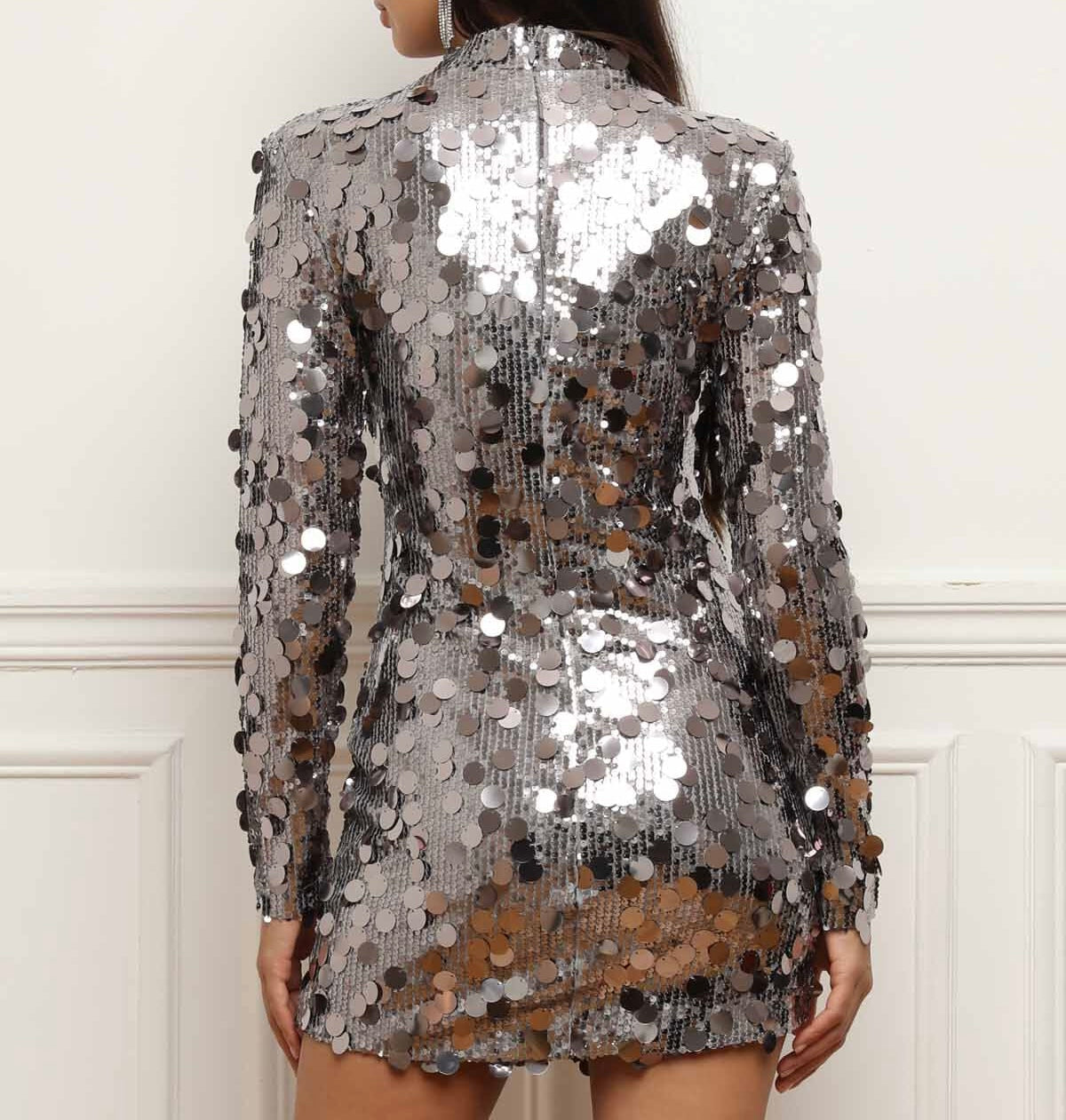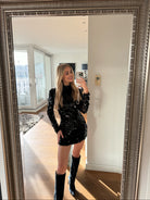 Dieses atemberaubende, schwarze Paillettenkleid ist der Inbegriff von Eleganz und Glamour. Das figurbetonte Design mit langen Ärmeln und einem hochgeschlossenen Kragen betont deine Silhouette und sorgt für einen stilvollen Auftritt. Die funkelnden Pailletten verleihen dem Kleid eine luxuriöse Ausstrahlung und machen es zur perfekten Wahl für besondere Anlässe wie Weihnachten, Silvester oder elegante Abendveranstaltungen.
