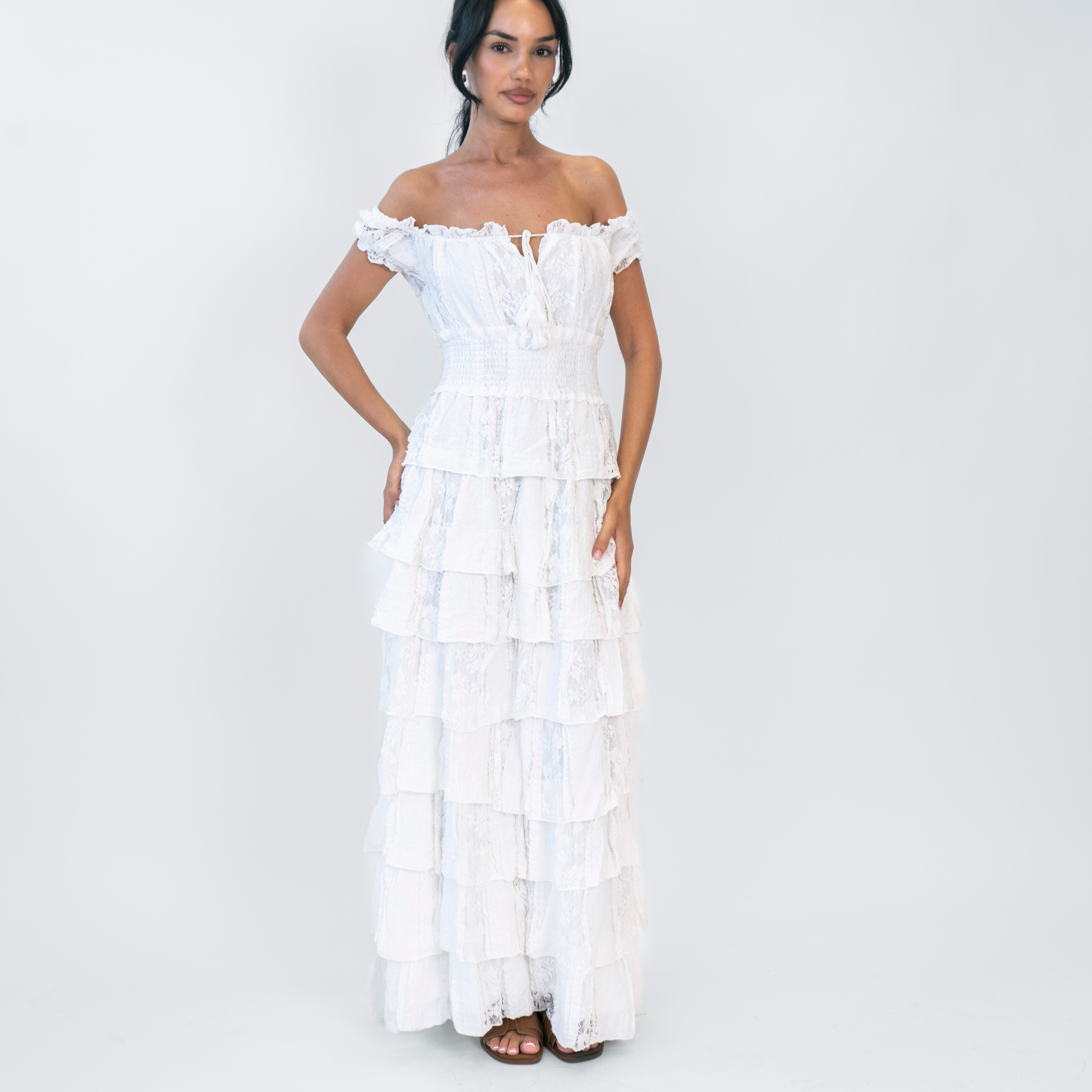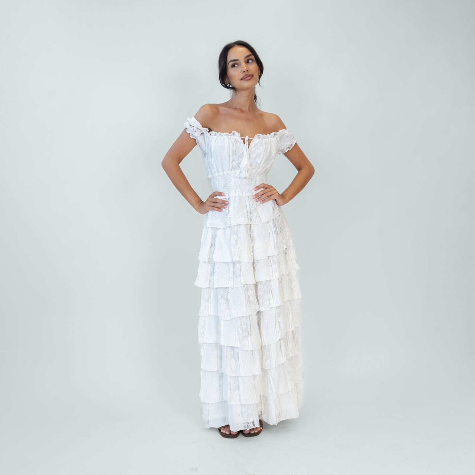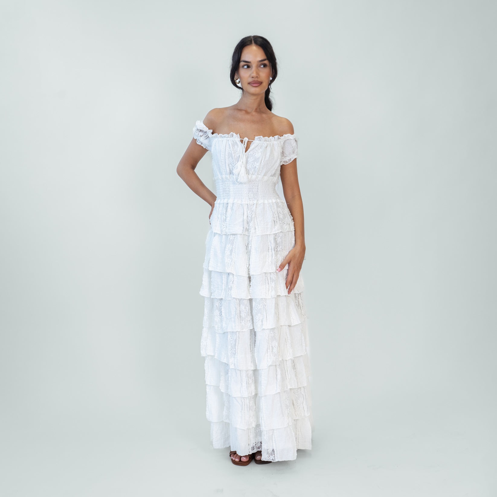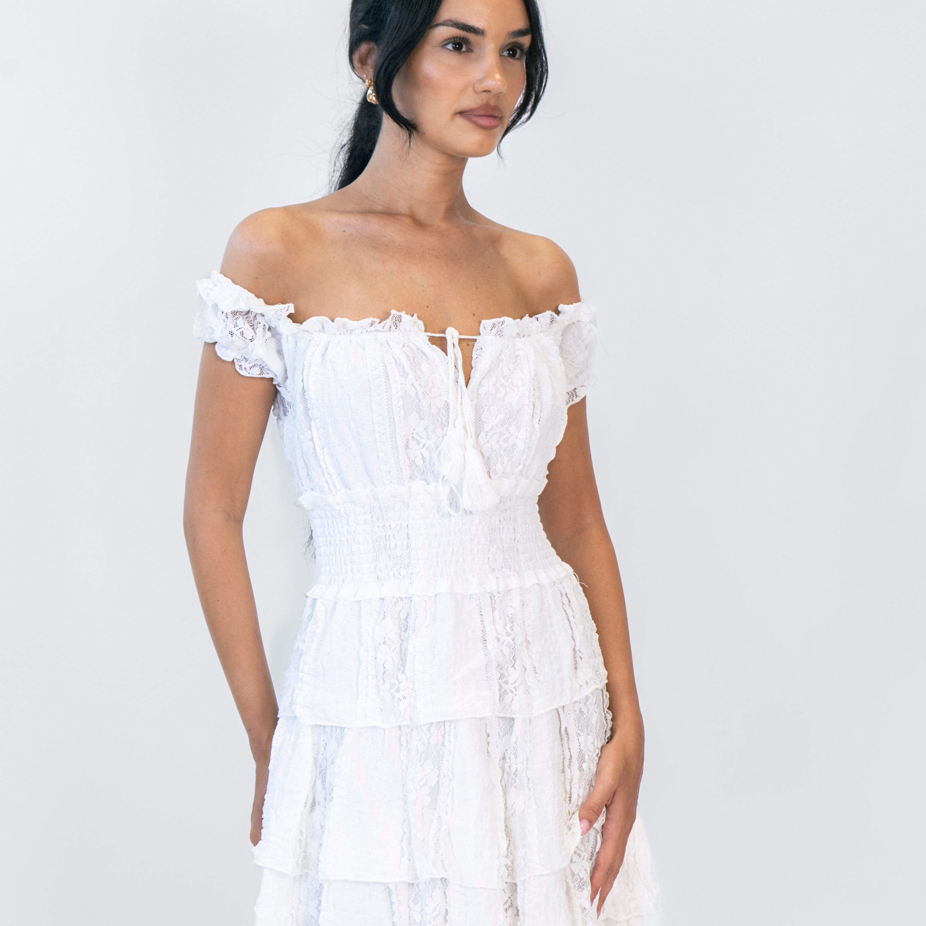 Ein Traum in Weiß – das Boho Romance Dress vereint verspielte Leichtigkeit mit romantischer Eleganz. Der schulterfreie Schnitt mit zarten Rüschen betont dein Dekolleté und sorgt für einen femininen, sommerlichen Look. Die luftige A-Linie mit fließenden Stufen wirkt charmant und figurschmeichelnd, während feine Spitzendetails dem Kleid einen edlen Boho-Touch verleihen.