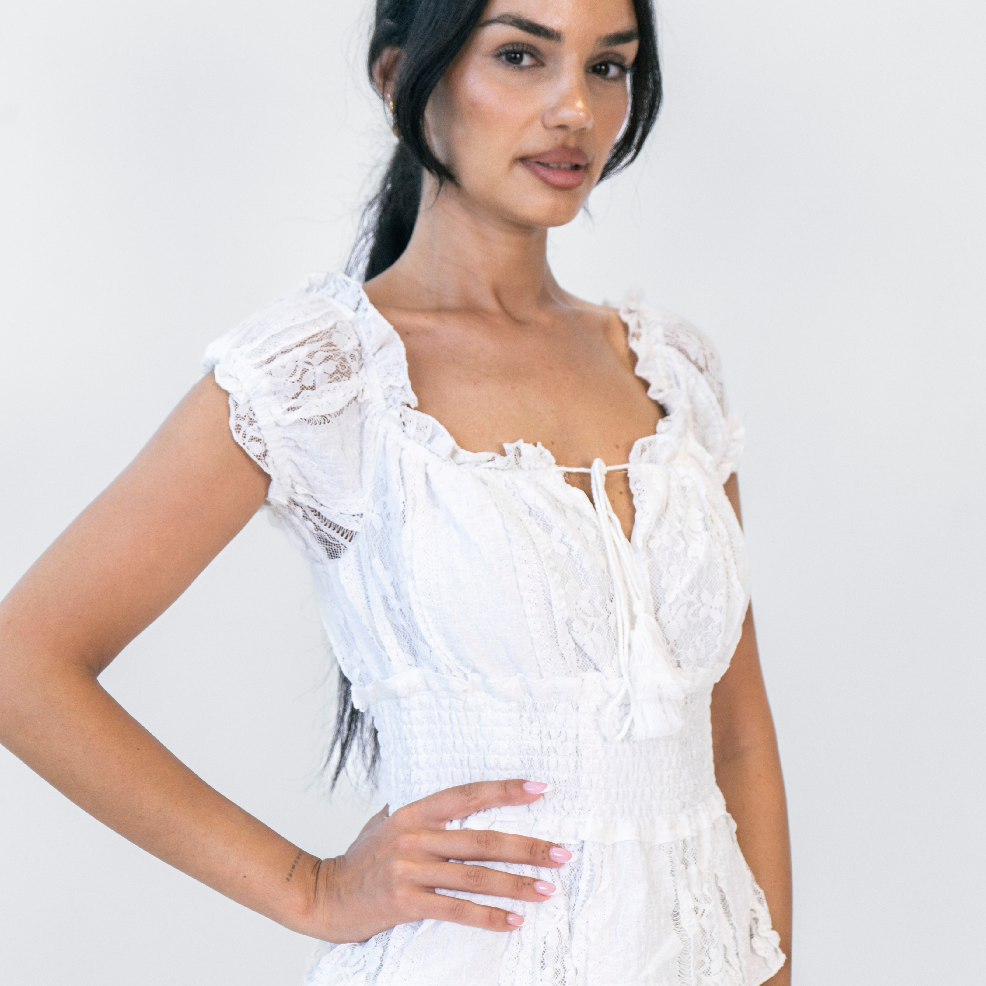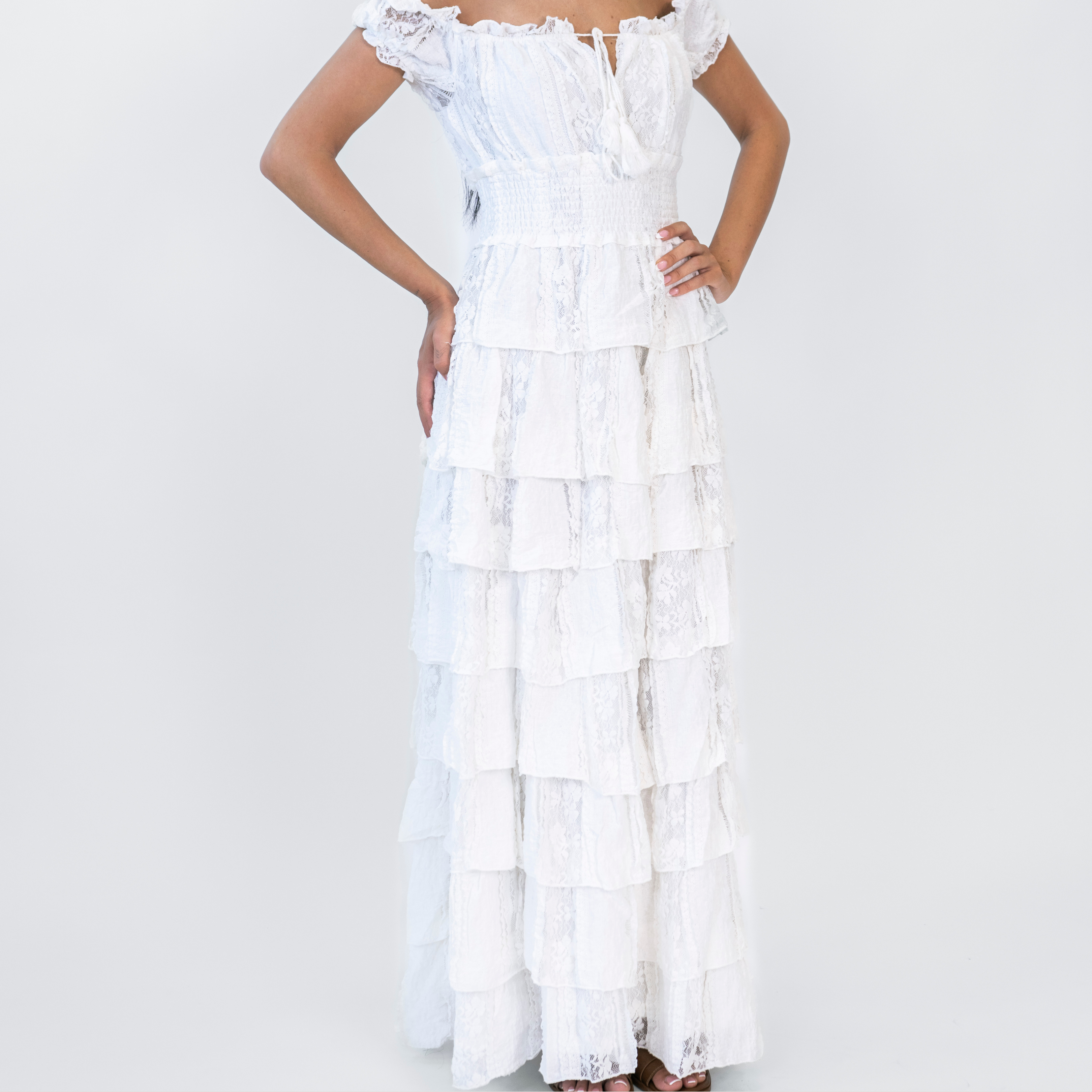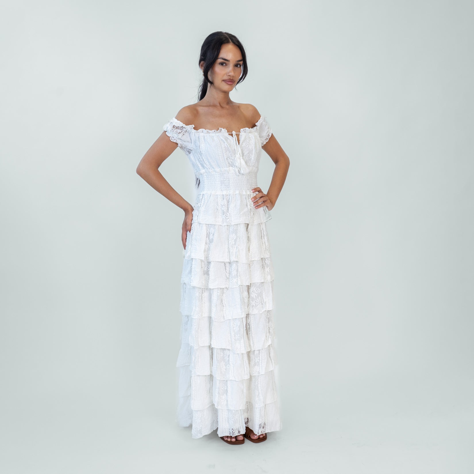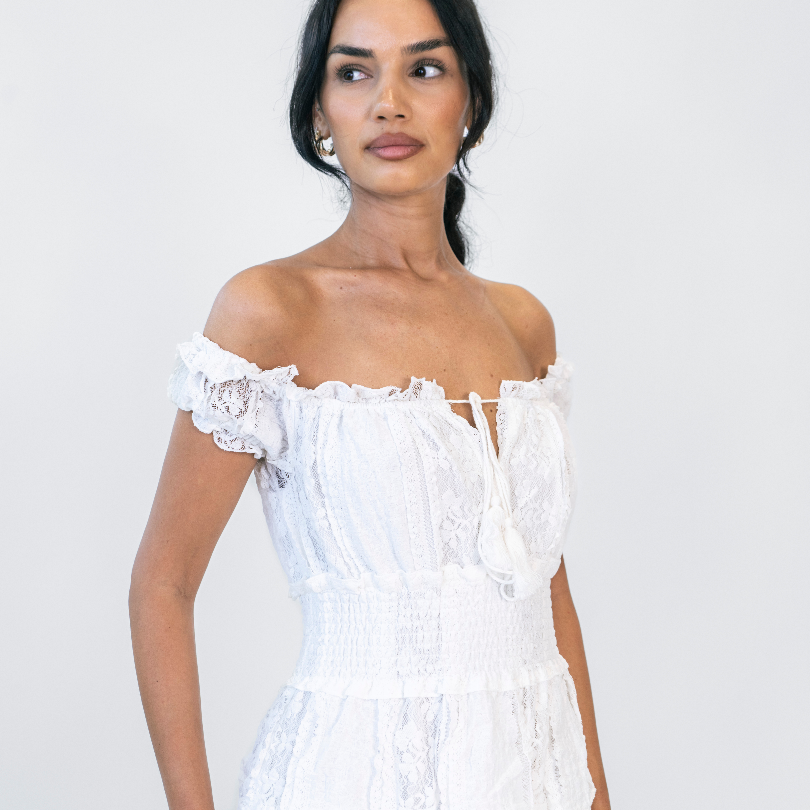 Ein Traum in Weiß – das Boho Romance Dress vereint verspielte Leichtigkeit mit romantischer Eleganz. Der schulterfreie Schnitt mit zarten Rüschen betont dein Dekolleté und sorgt für einen femininen, sommerlichen Look. Die luftige A-Linie mit fließenden Stufen wirkt charmant und figurschmeichelnd, während feine Spitzendetails dem Kleid einen edlen Boho-Touch verleihen.