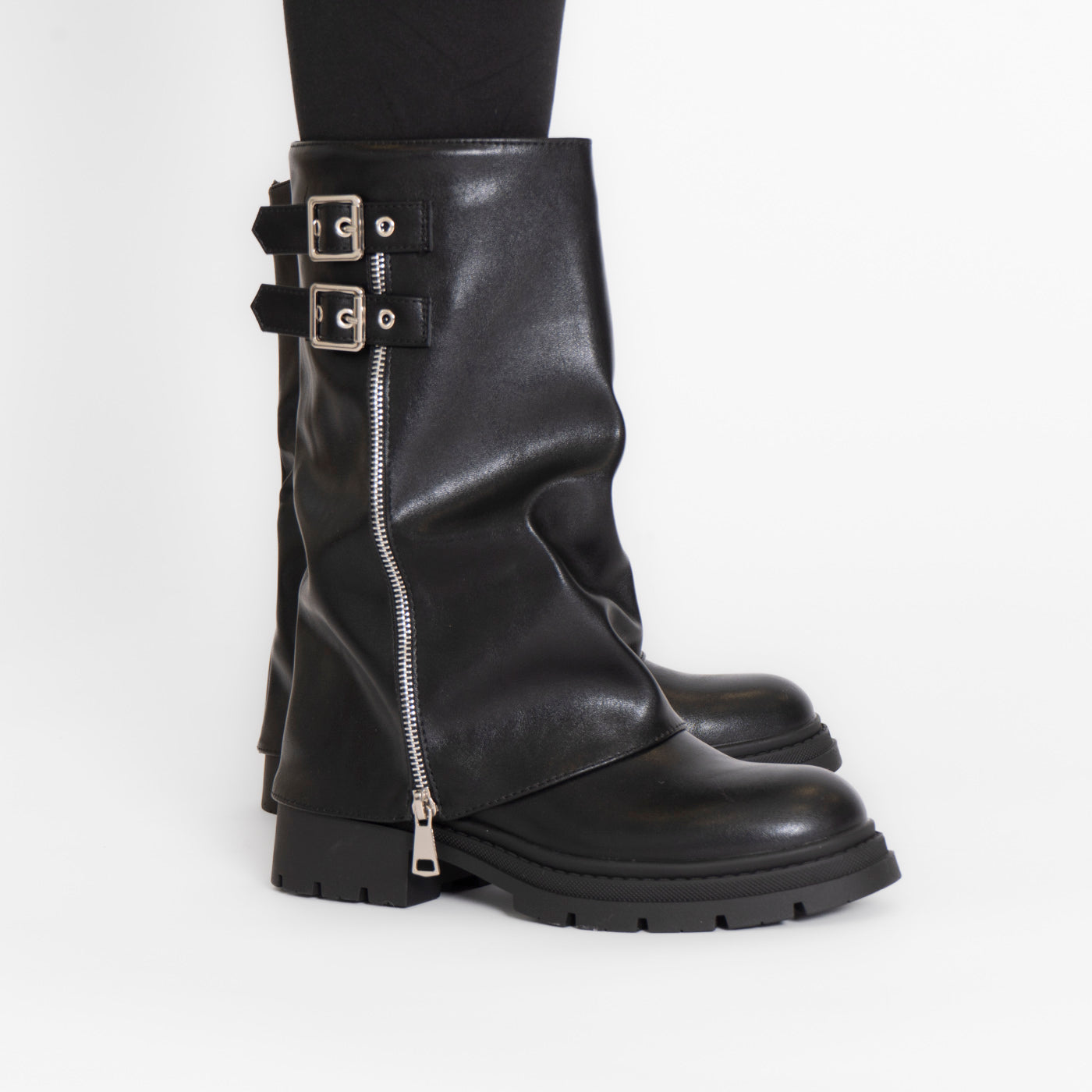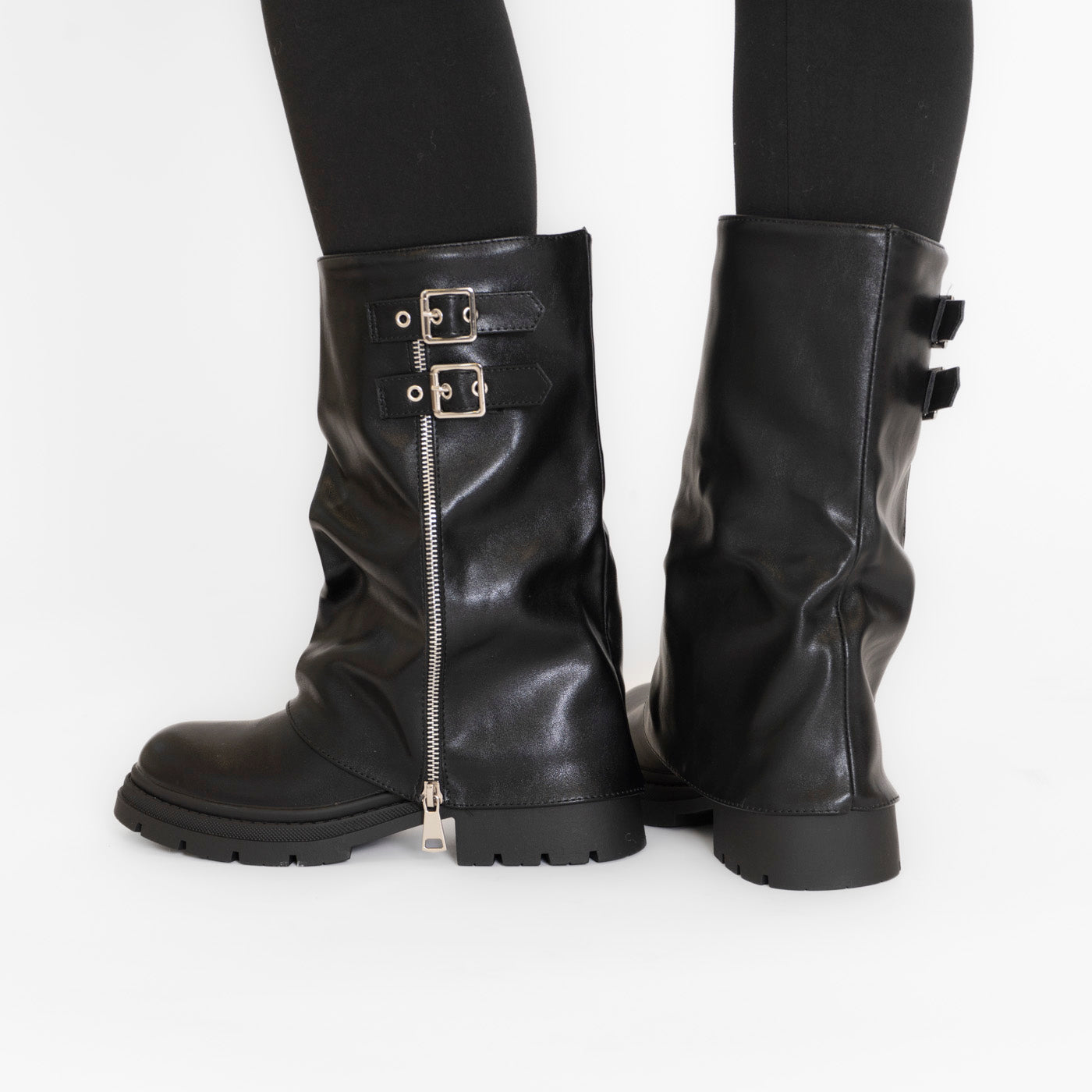 Unsere Chunky Bolt Boots sind der perfekte Mix aus Streetstyle und Funktionalität. Die markante Profilsohle sorgt für einen coolen, urbanen Look und die doppelten Schnallen sowie der seitliche Deko-Zipper geben den Boots ihr edgy Finish – perfekt, um jedem Outfit ein Statement zu verleihen.