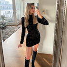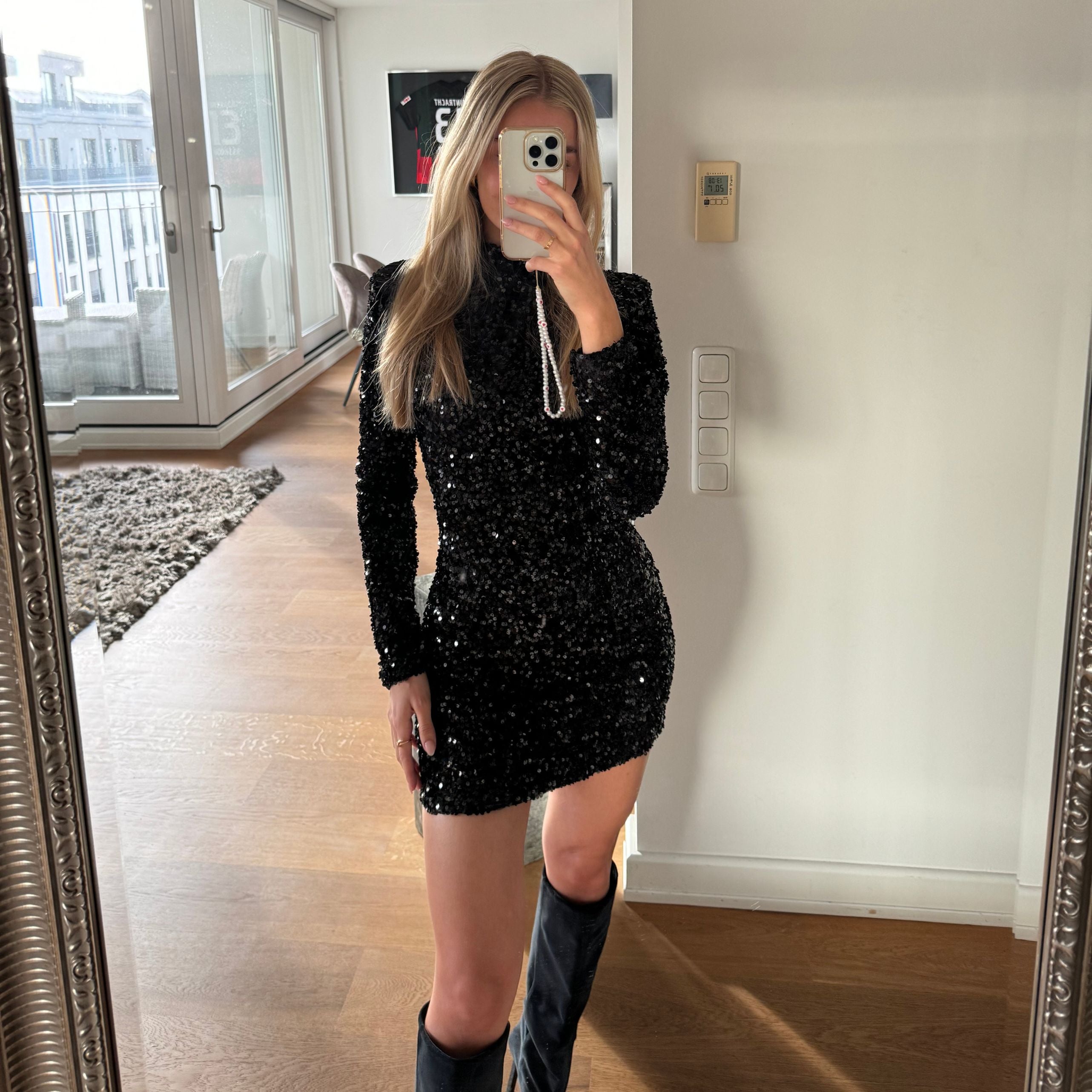 Dieses atemberaubende, schwarze Paillettenkleid ist der Inbegriff von Eleganz und Glamour. Das figurbetonte Design mit langen Ärmeln und einem hochgeschlossenen Kragen betont deine Silhouette und sorgt für einen stilvollen Auftritt. Die funkelnden Pailletten verleihen dem Kleid eine luxuriöse Ausstrahlung und machen es zur perfekten Wahl für besondere Anlässe wie Weihnachten, Silvester oder elegante Abendveranstaltungen.