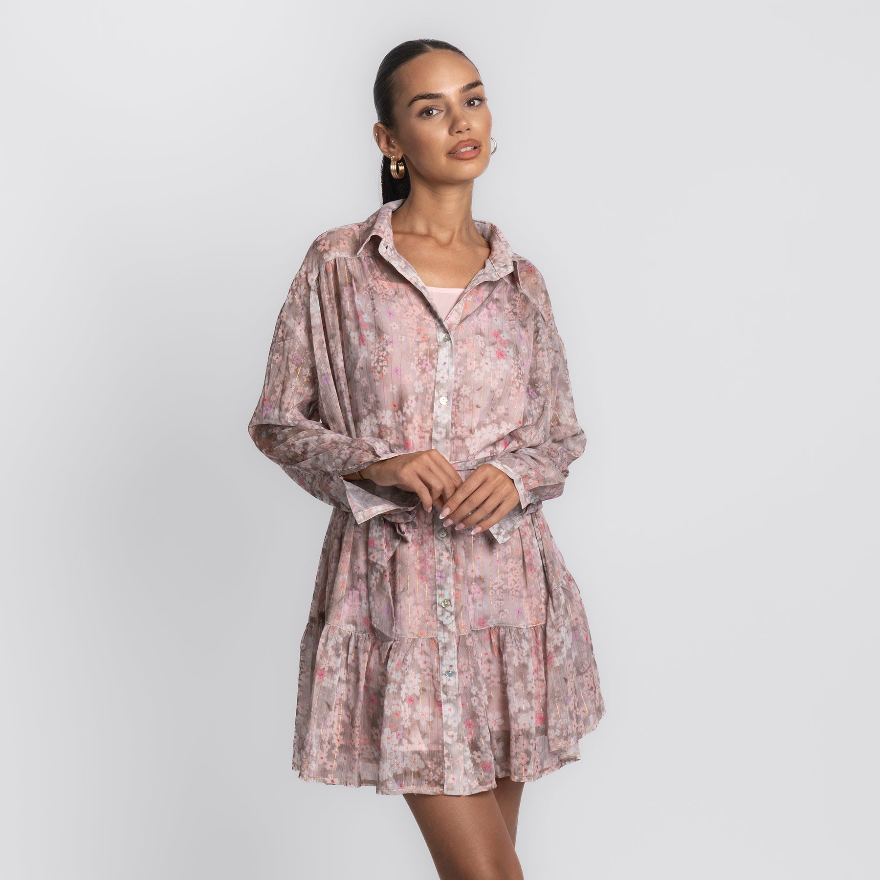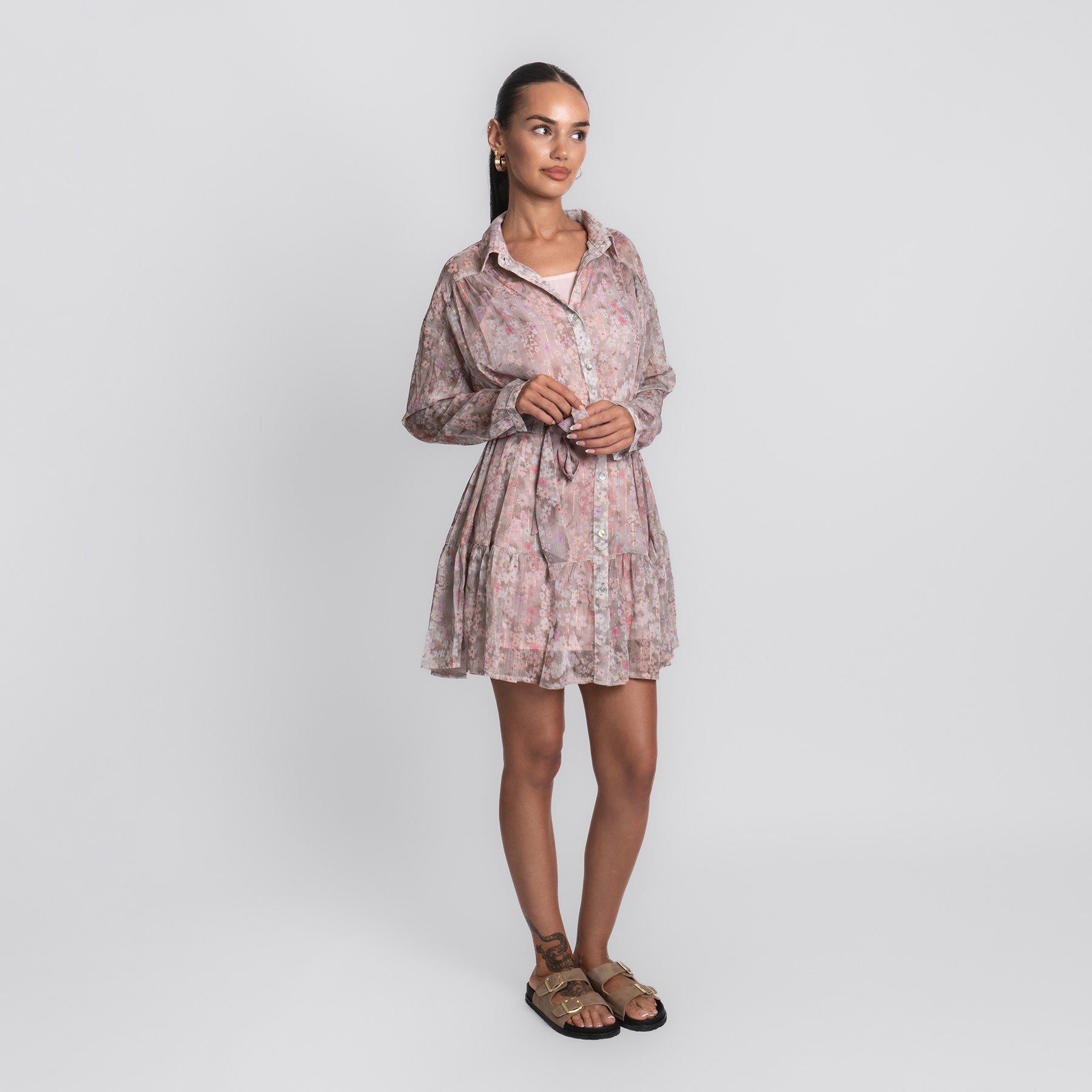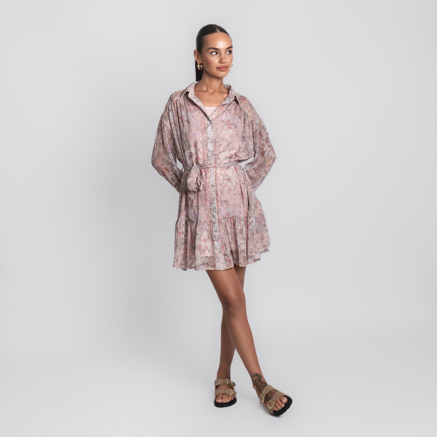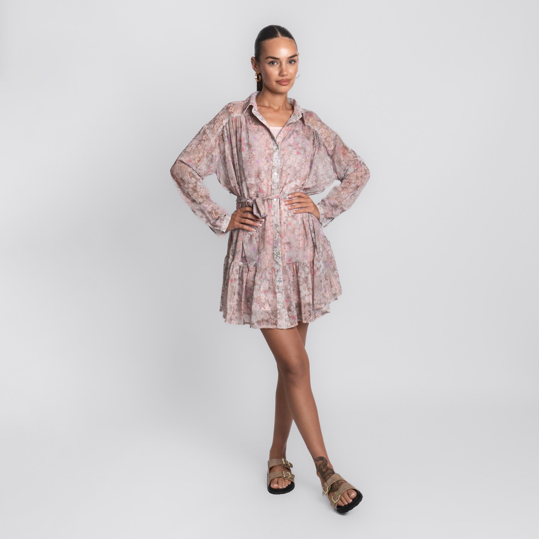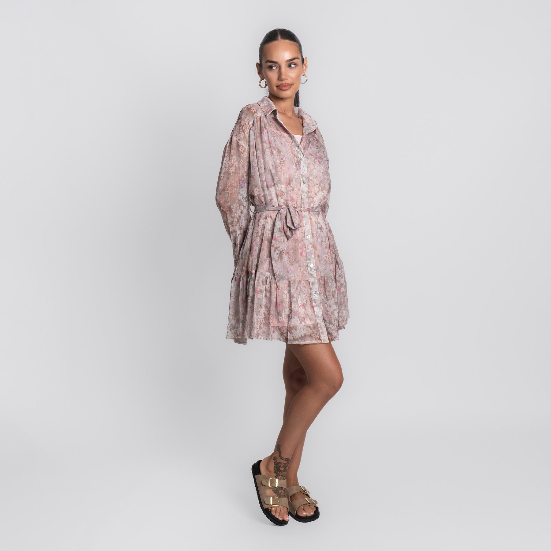 Zart, verspielt und wie gemacht für sonnige Tage – das Pink Flower Dress bringt romantische Leichtigkeit in deinen Look. Mit seinem floralen Muster in sanften Rosé- und Beigetönen, dem fließenden Schnitt und den feinen Details ist es ein echtes Lieblingsstück für Frühling und Sommer.