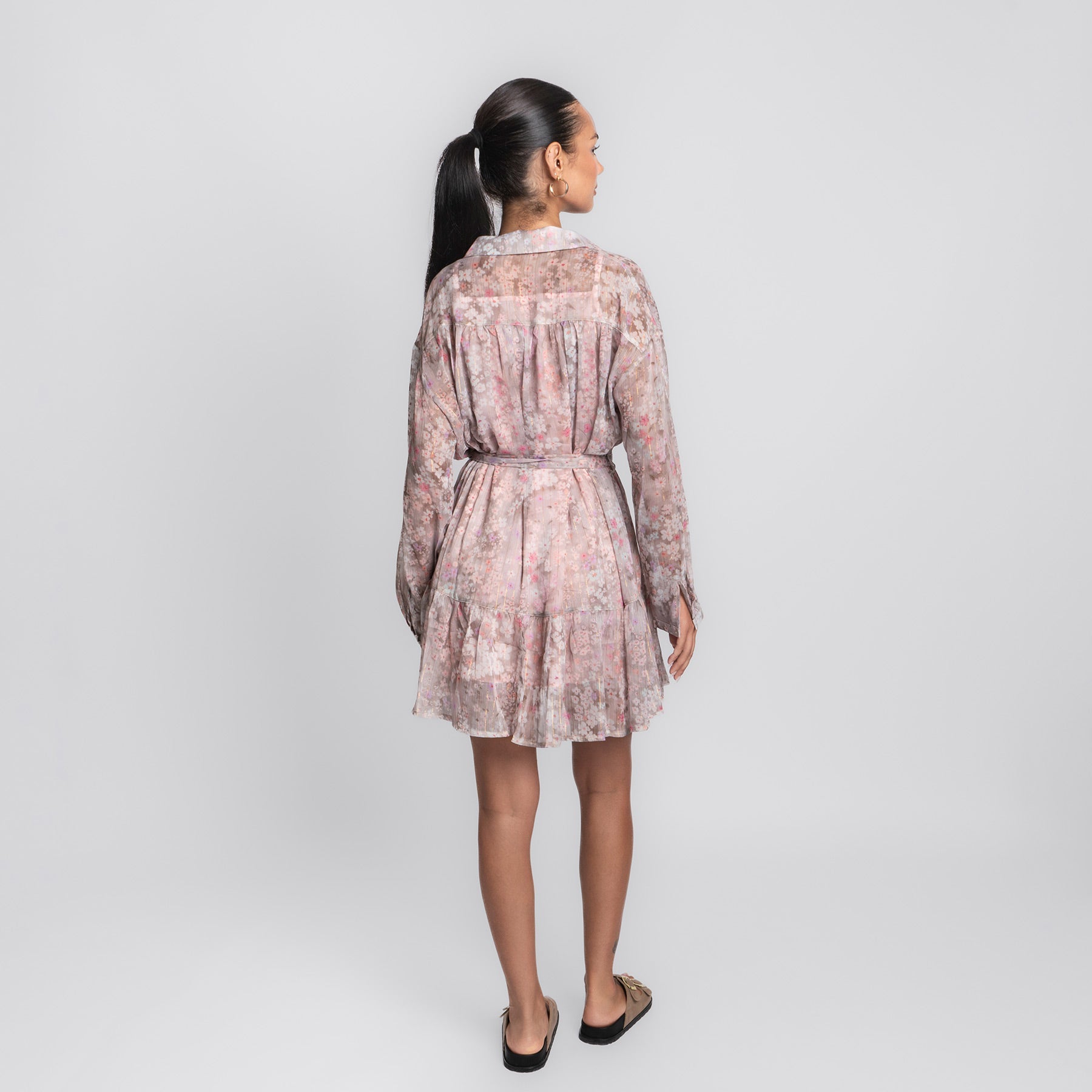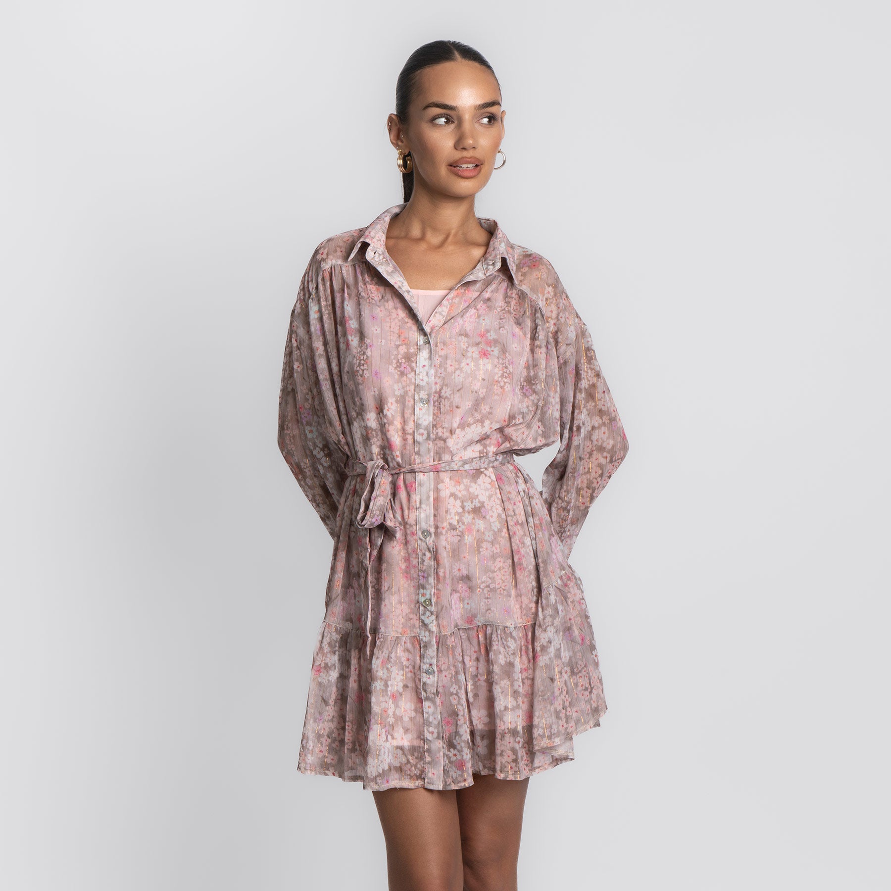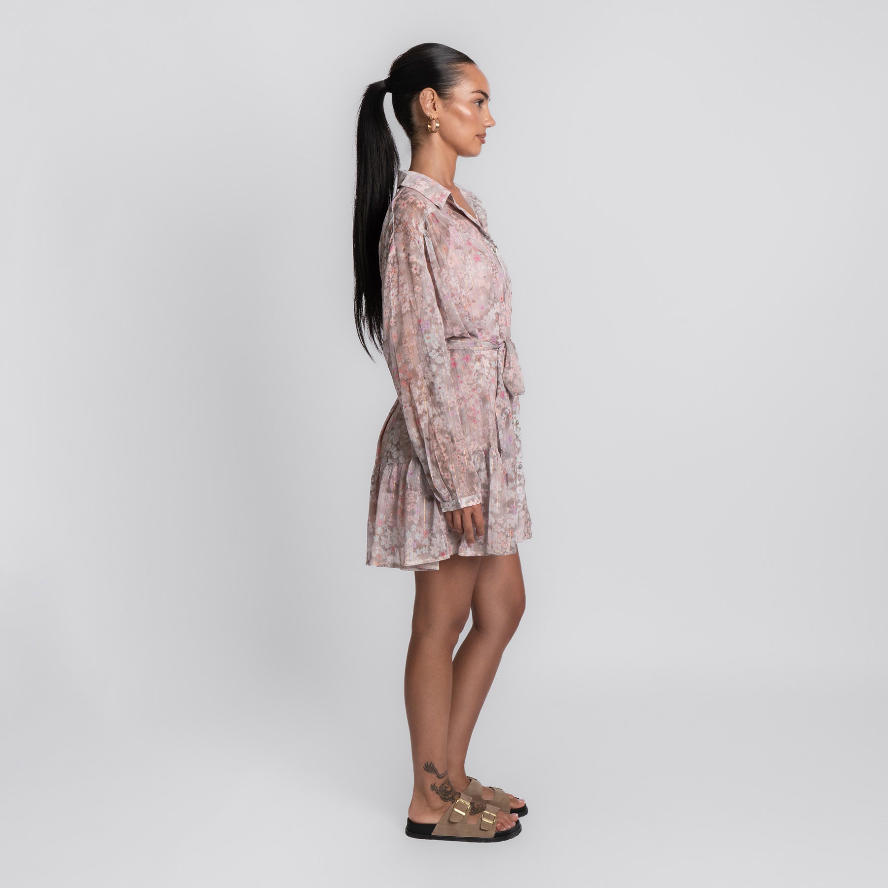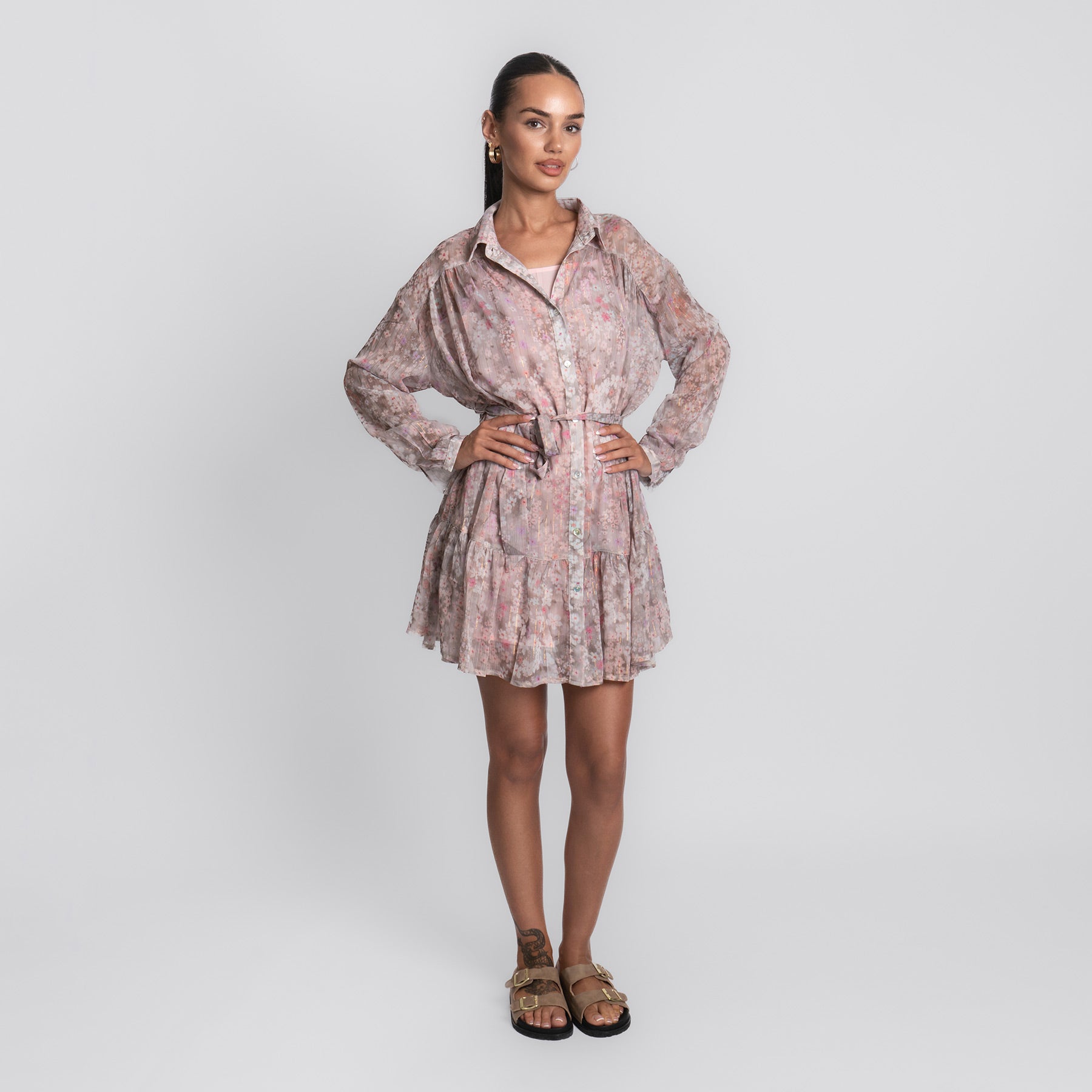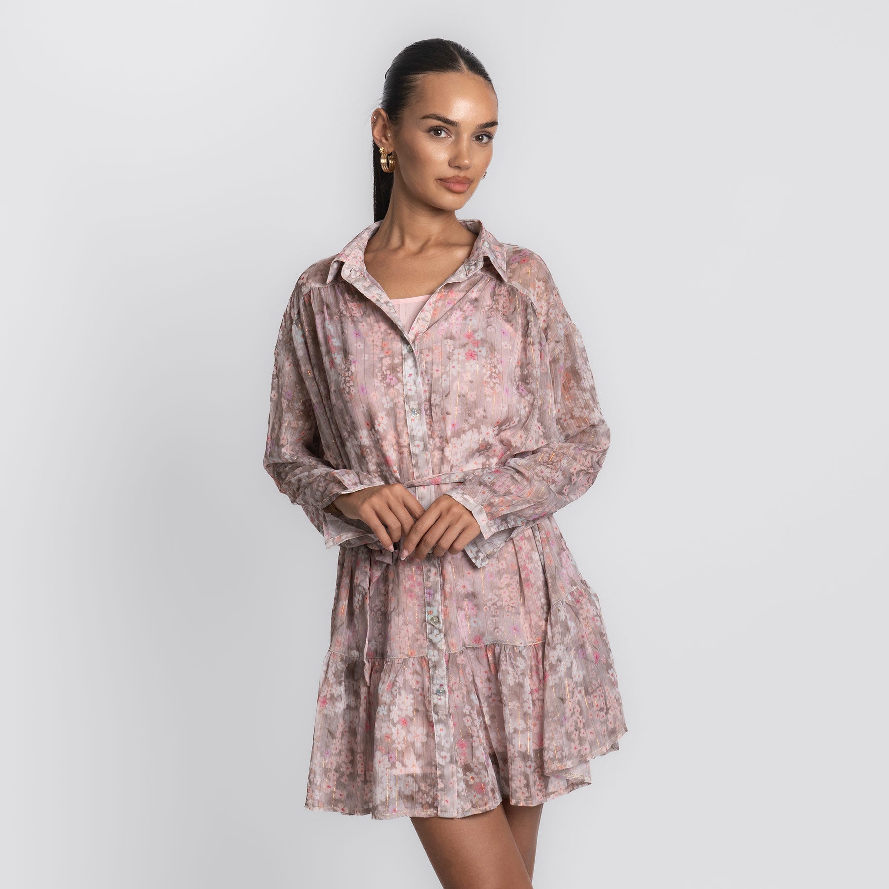 Zart, verspielt und wie gemacht für sonnige Tage – das Pink Flower Dress bringt romantische Leichtigkeit in deinen Look. Mit seinem floralen Muster in sanften Rosé- und Beigetönen, dem fließenden Schnitt und den feinen Details ist es ein echtes Lieblingsstück für Frühling und Sommer.